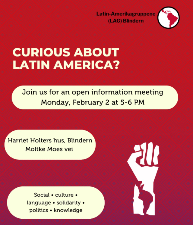 Do you want to engage in culture, politics, language – or anything else related to Latin America? Join Latin-Amerikagruppene Blindern for our info meeting!