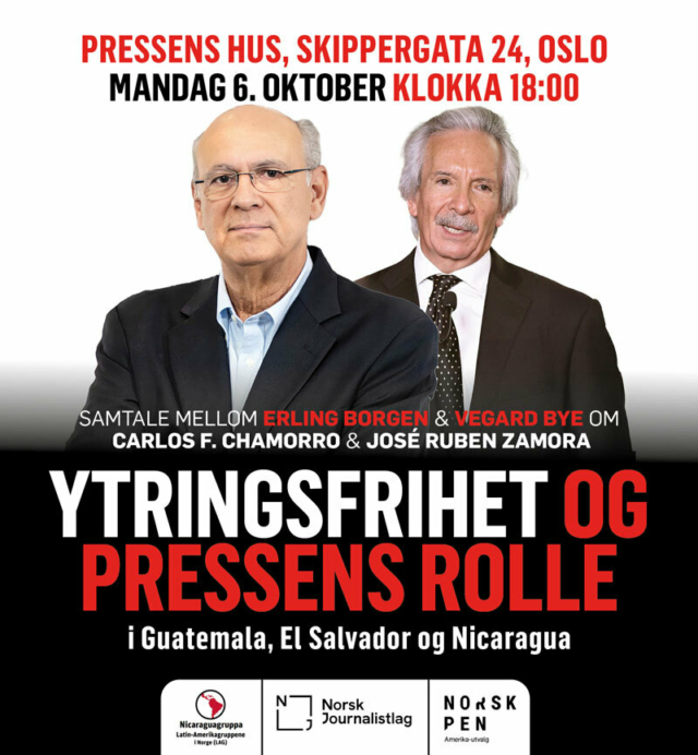 Hva skjer når frie medier knebles, redaktører fengsles og journalister tvinges i eksil? Bli med på samtale med Erling Borgen og Vegard Bye om pressens rolle i Guatemala, El Salvador og Nicaragua – og om kampen til to av regionens mest forfulgte journalister, José Rubén Zamora og Carlos F. Chamorro. Gjennom filmklipp og refleksjon settes søkelys på mot, makt og medias avgjørende betydning i autoritære tider.